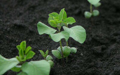 自社農園で6月に植え付ける大豆の苗。九州の品種フクユタカは大きくふっくらした実が特徴です。
