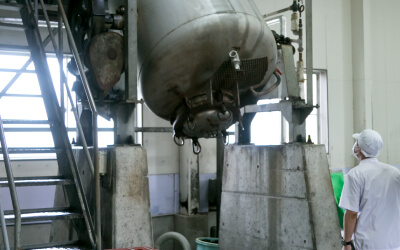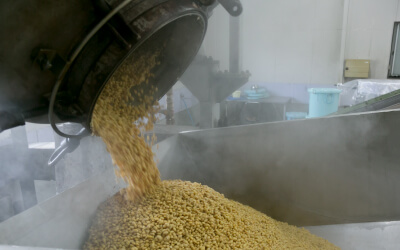 乾燥大豆を浸漬。硬めに蒸して、麹が付きやすい柔らかさに蒸し上げます。