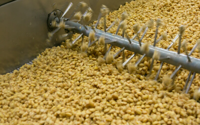乾燥大豆を浸漬、手でつまめる柔らかさに蒸し上げます。