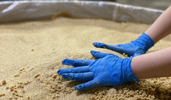 大豆と麹をよく混ぜ合わせ、醤油種麹を振り入れます。まんべんなく混ぜ合わせると炒った小麦の麦茶のような芳しい香りに包まれます。