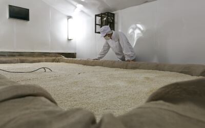 製麹 手麹にこだわり、2つの室で醸します。味噌の香り、旨み、コク、良い麹菌はじっくり時間をかけて醸します。