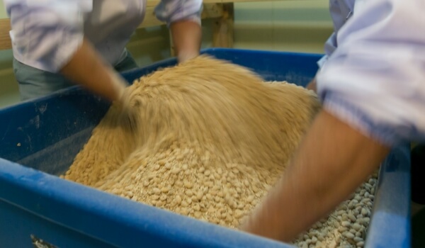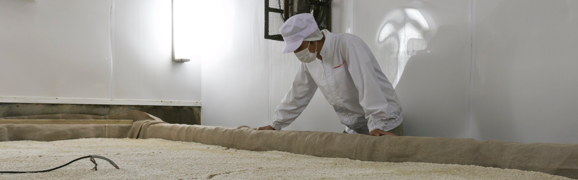 甑に手作業で敷きこんで、翌朝麹の具合いを見て手入れをします。香りを引き出す醤油麹は足が速く、麹の花の咲き具合を見極めるのは熟練の技。2回目の手入れも文字通り手作業で。丸48時間かけて専用室で醸す醤油麹、質実剛健な澄んだ風味はこの麹が要です。