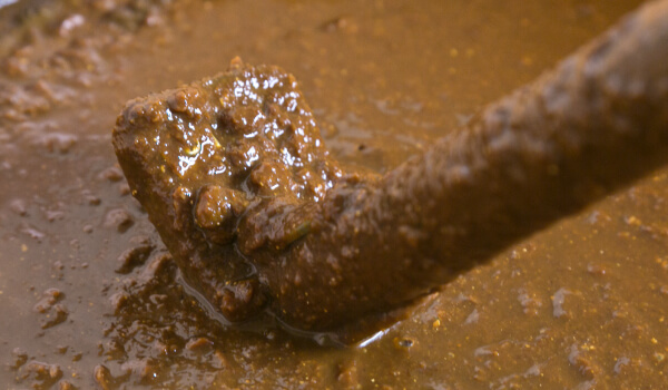 溶かした塩水とほど良くベージュ色に仕上がった麹をあわせて仕込みます。これから1年以上の長い時間をかけて麹が大豆を分解 し、旨い醤油になるのです。重しをかけ、自然に滴らせ10日間かけて圧搾します。一番搾りだけのキレのあるまろやかな味わいです。